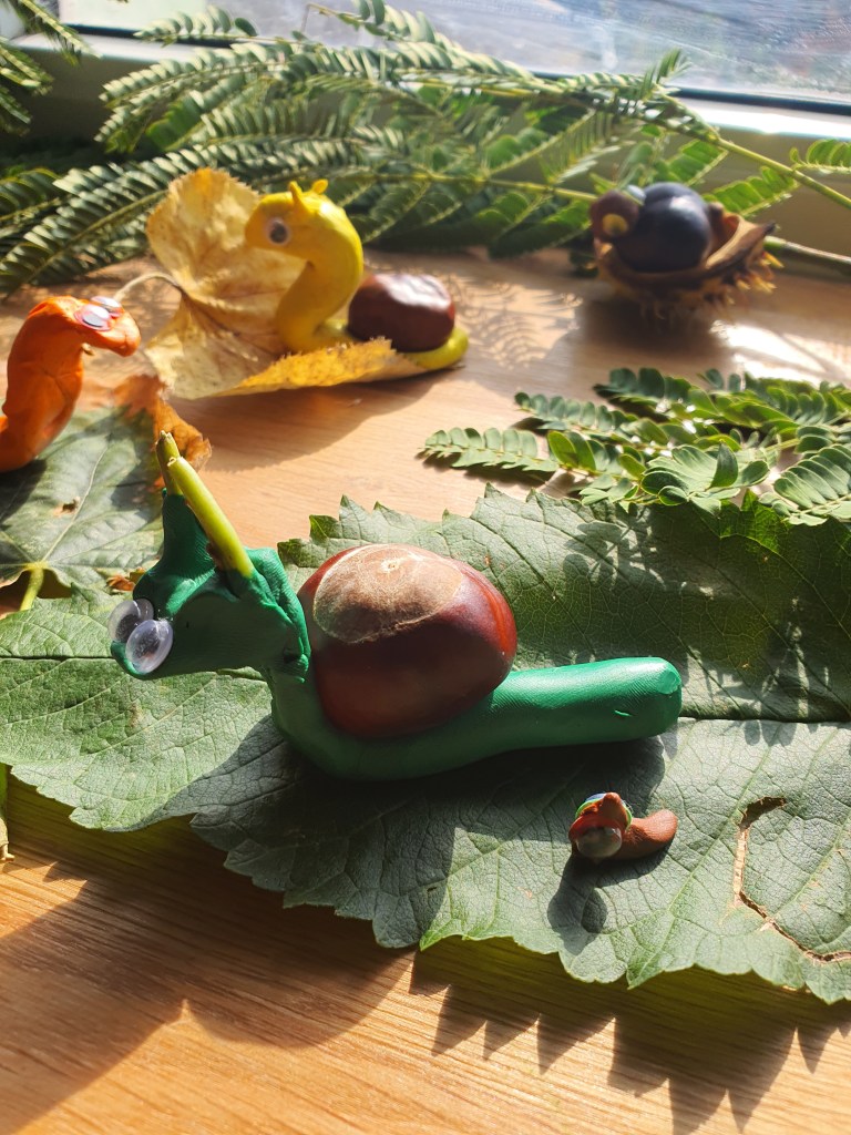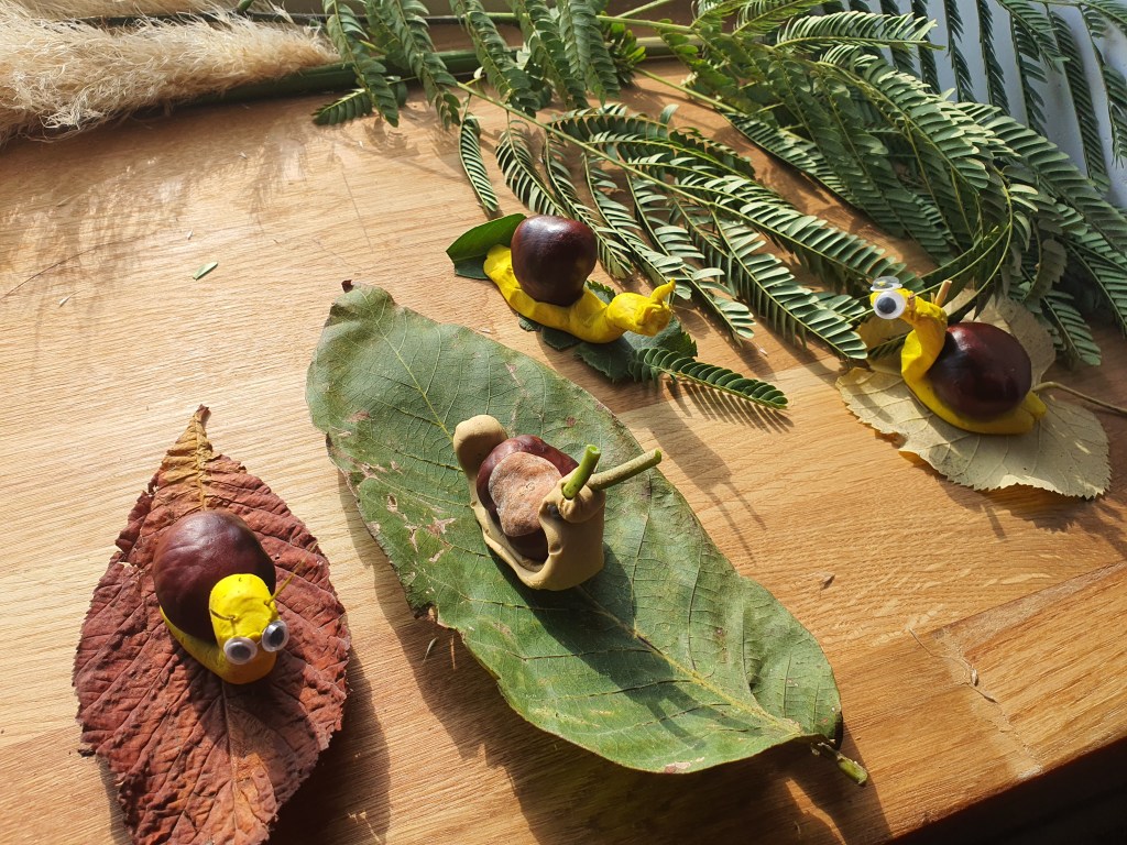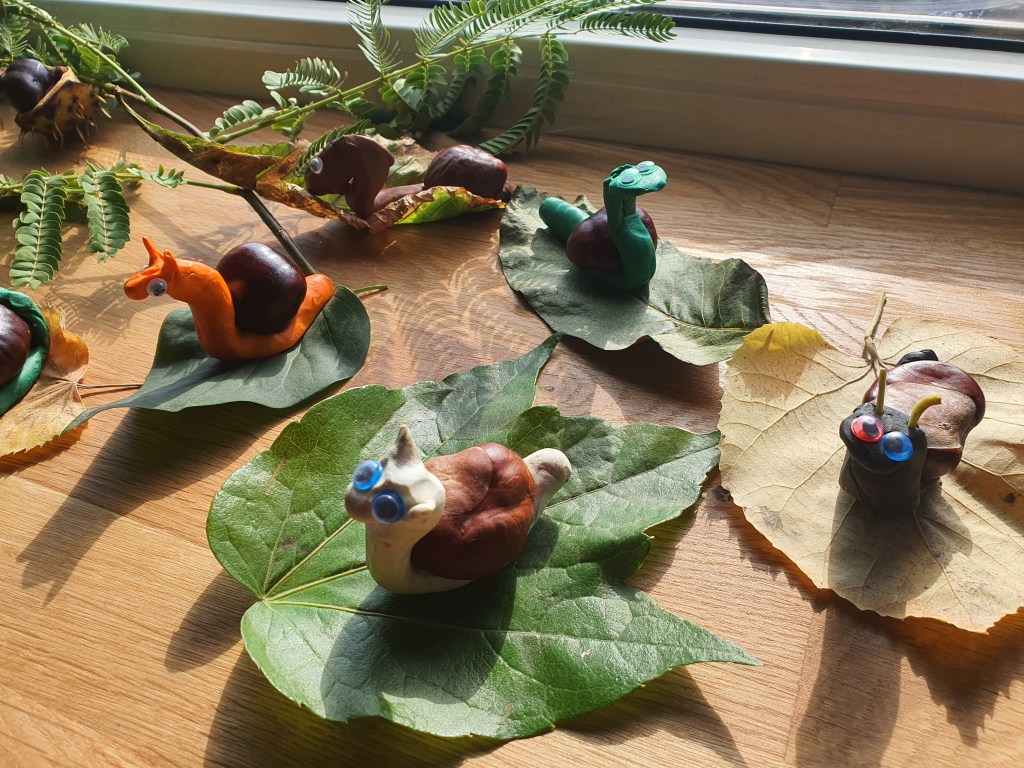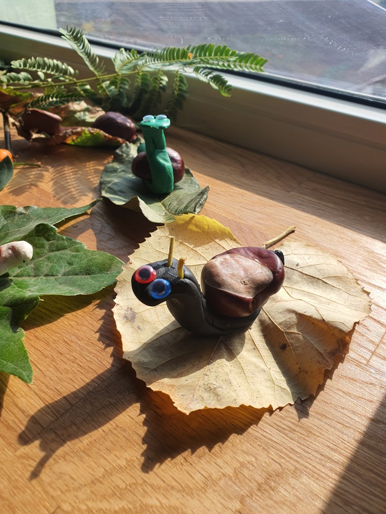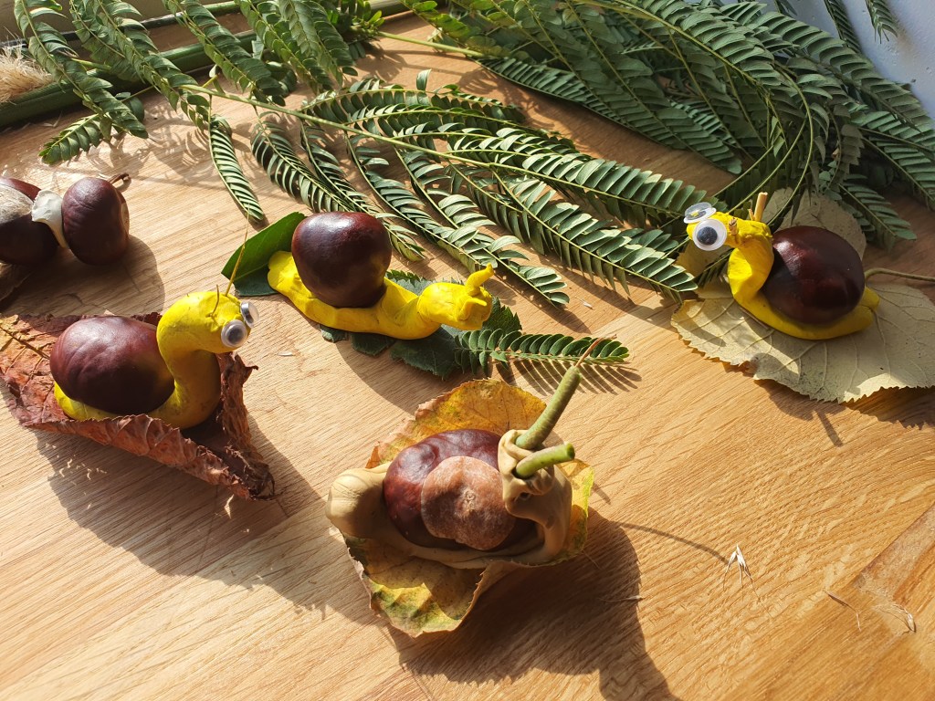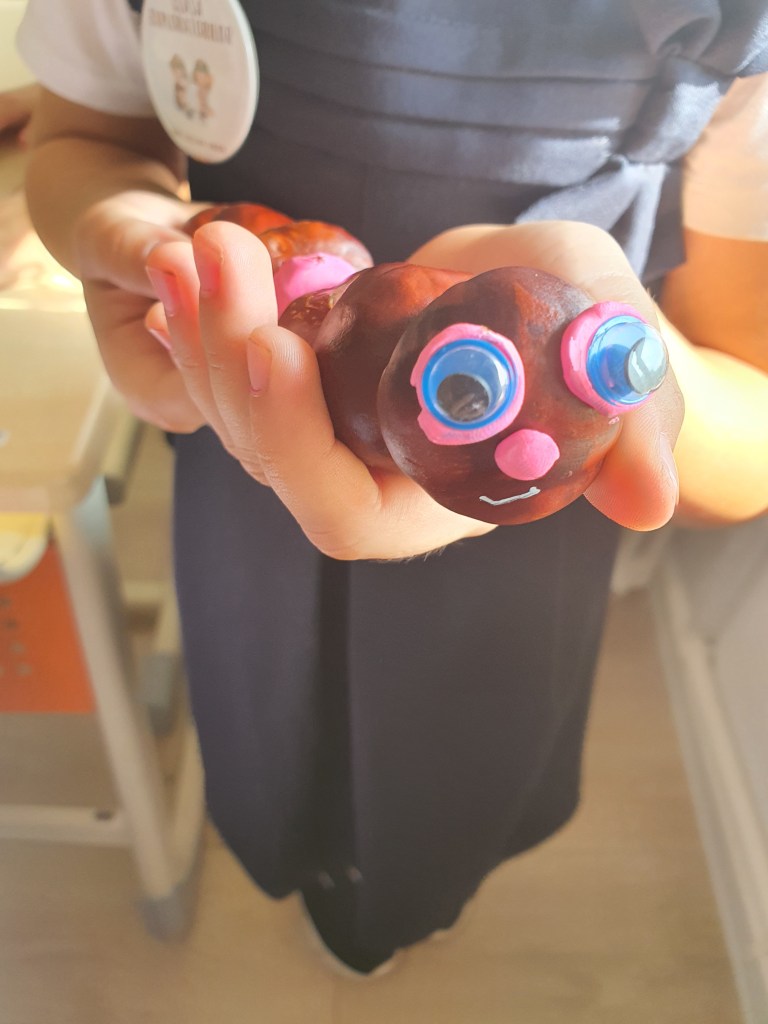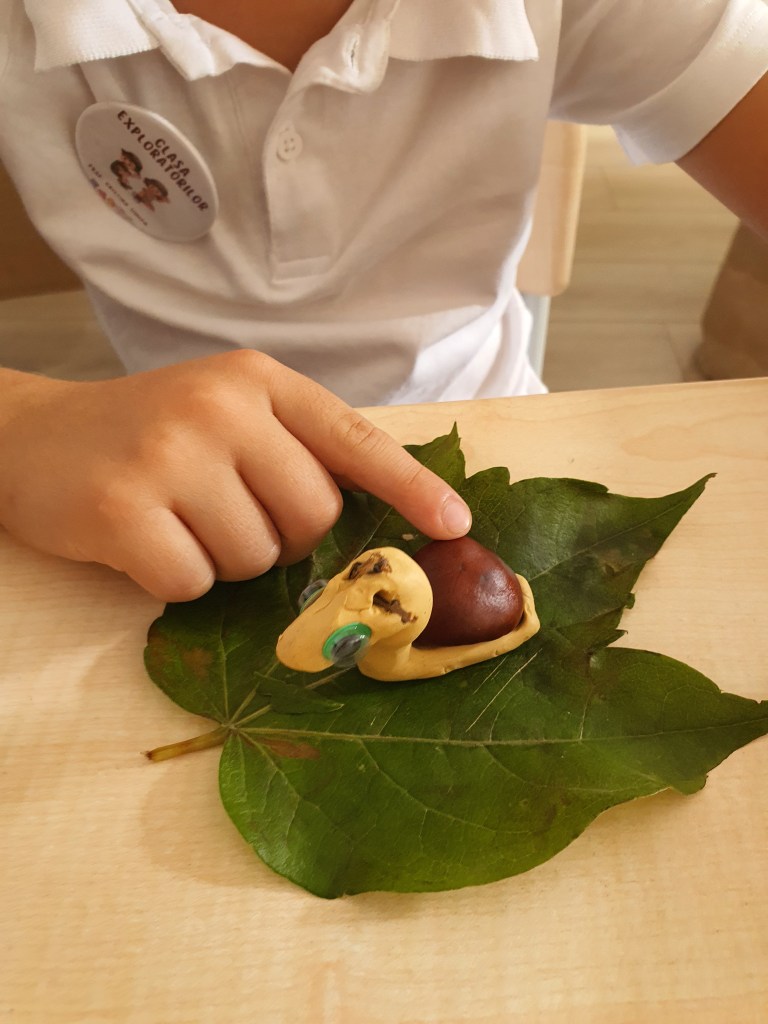 Materiale de lucru: castane, frunze, crenguțe, plastilină, ochișori mobili.