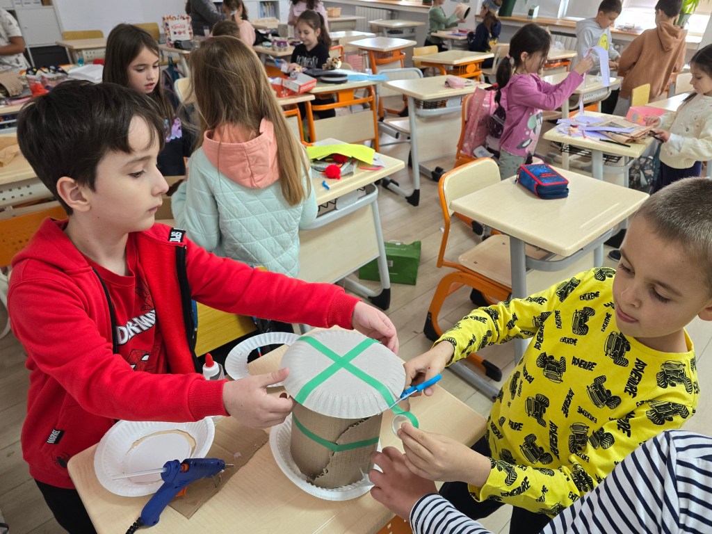 Ne-am alăturat cu entuziasm activității ,,Reciclează creativ!”, activitate propusă de profesorii de sport din școala noastră. Copiii au pregătit din timp materiale reciclabile (pet-uri, cartoane, ziare, capace de plastic erc) și-au făcut planuri și schițe, s-au înarmat cu pistoale de lipit, batoane din silicon, pastă de lipit etc și s-au apucat de confecționat pălării.