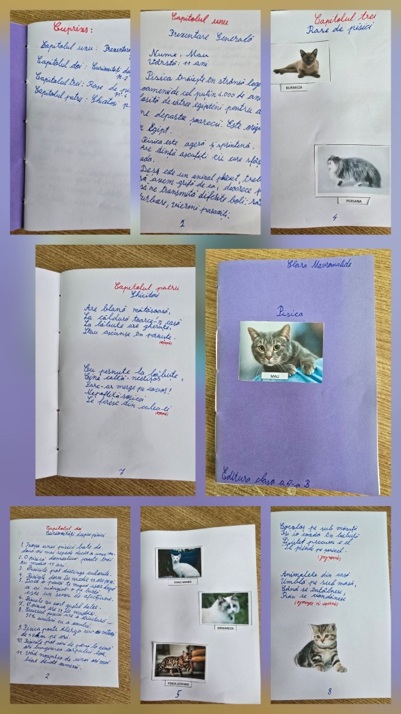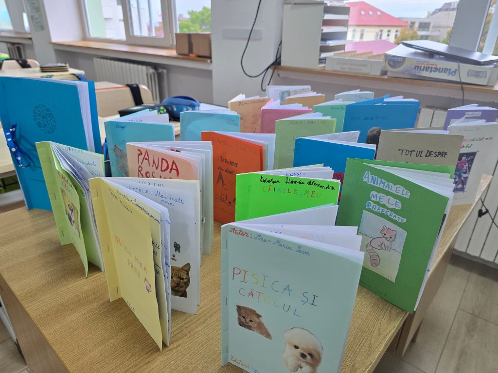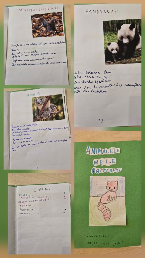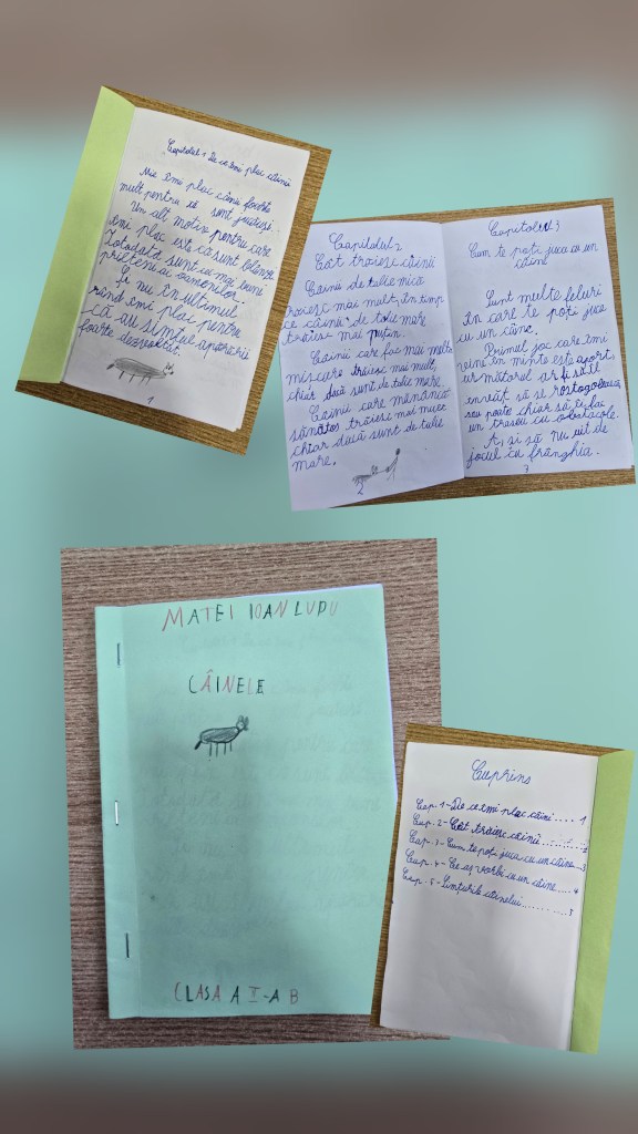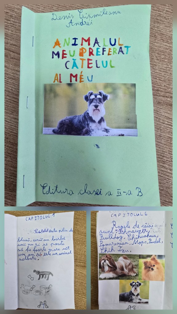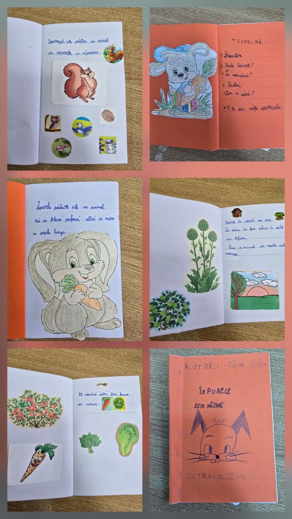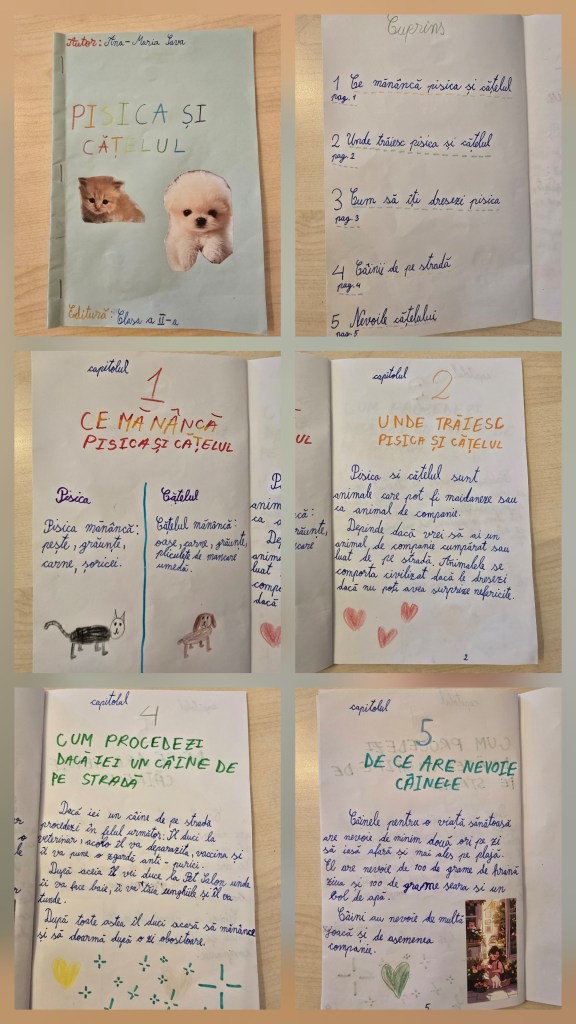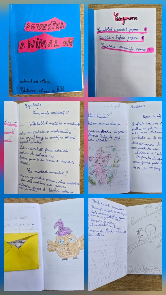 Cărțile confecționate de copii au fost pline de imaginație, muncă și entuziasm! Fie că au scris despre animalele preferate, prietenii necuvântători sau hobbyurile lor, micii autori au respectat toate elementele unei cărți adevărate: copertă, titlu, autor, cuprins, paginație, ba chiar și… Editura clasei! 📚✨