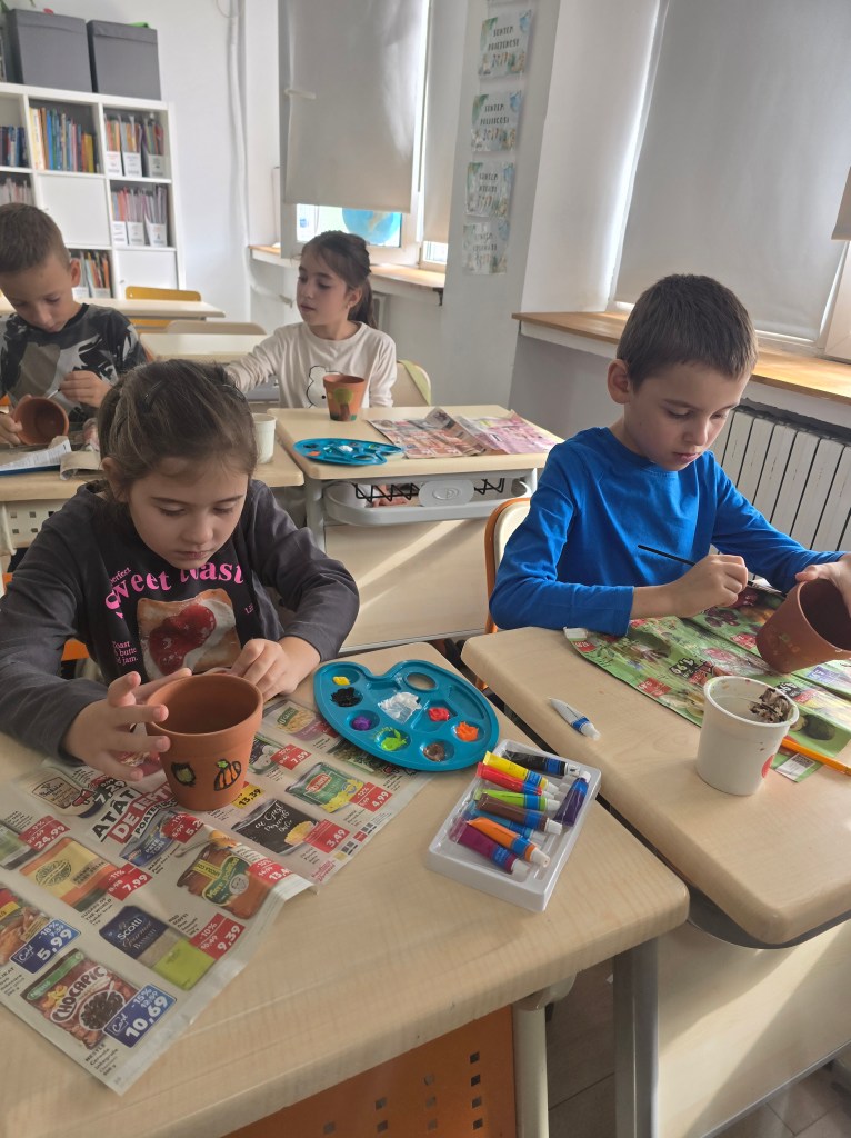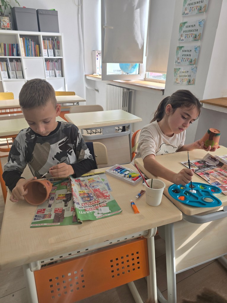 🌱 Plantează – În ghivecele pictate, au pus pământ și semințe, învățând despre ciclul de viață al plantelor și importanța lor pentru sănătatea planetei.