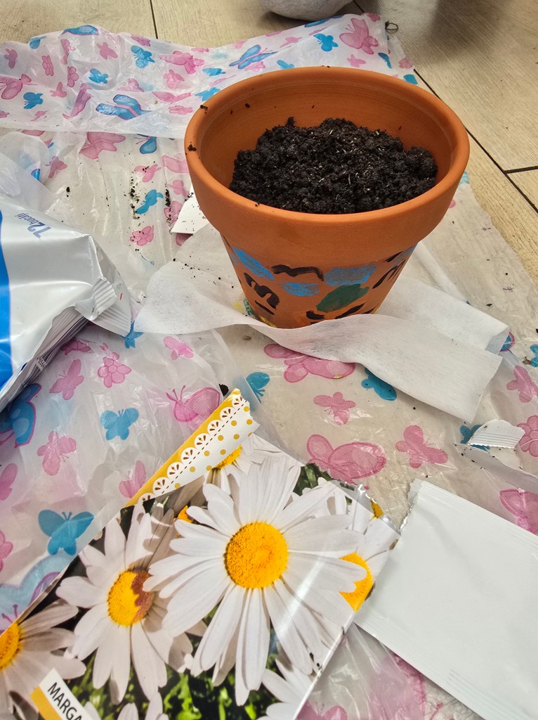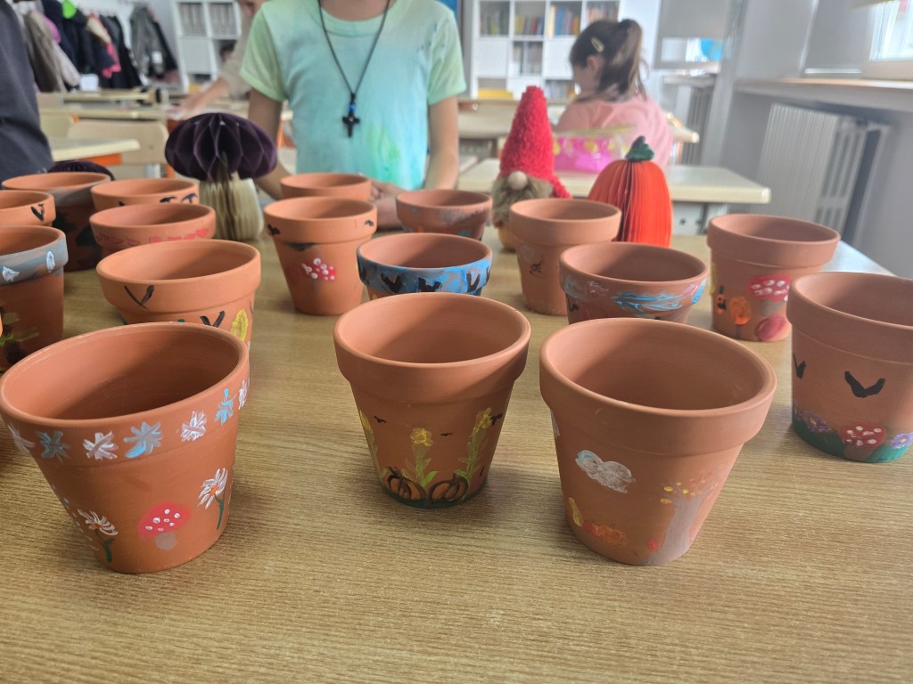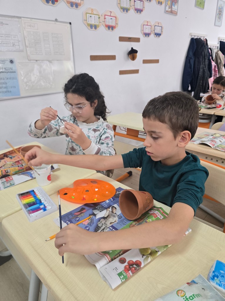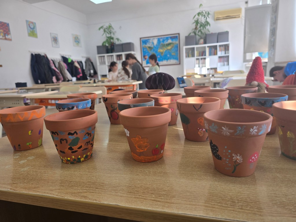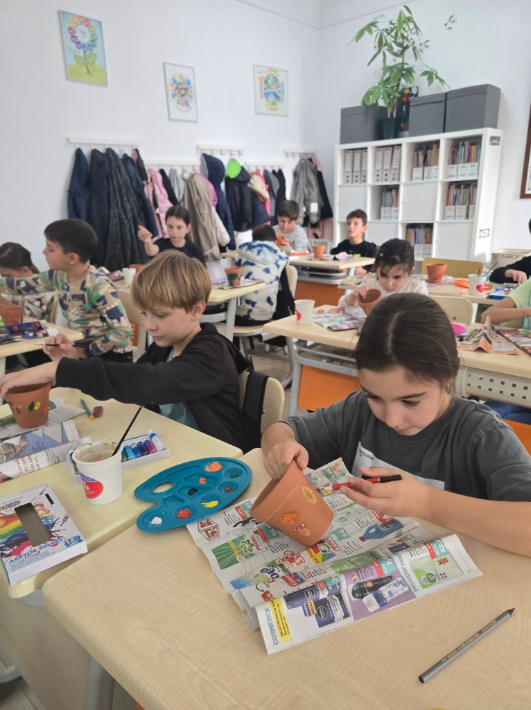🎨 Pictează – Fiecare copil și-a decorat propriul ghiveci din teracotă folosind acuarele acrilice. Cu pensule, apă și imaginație, au transformat simplele recipiente în mici opere de artă.