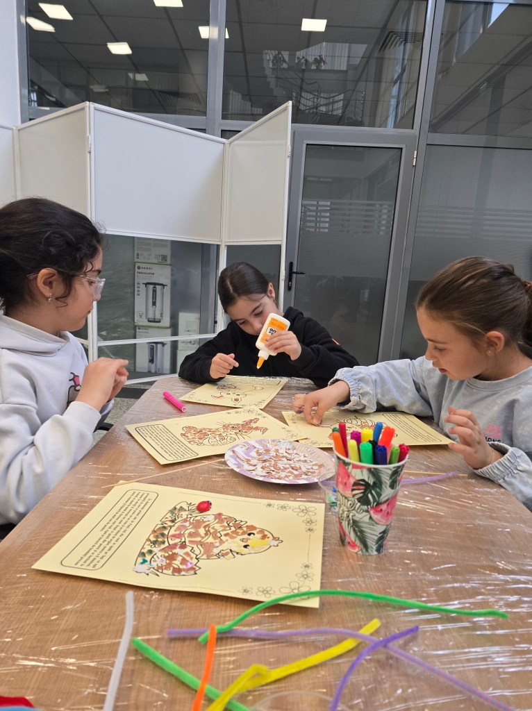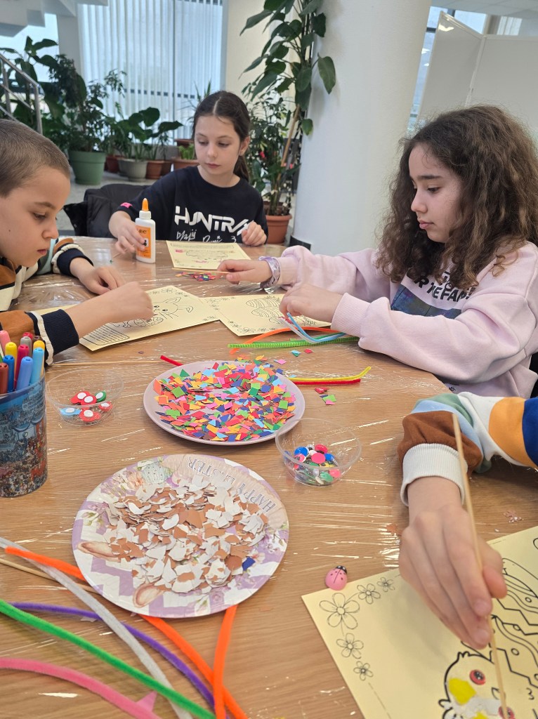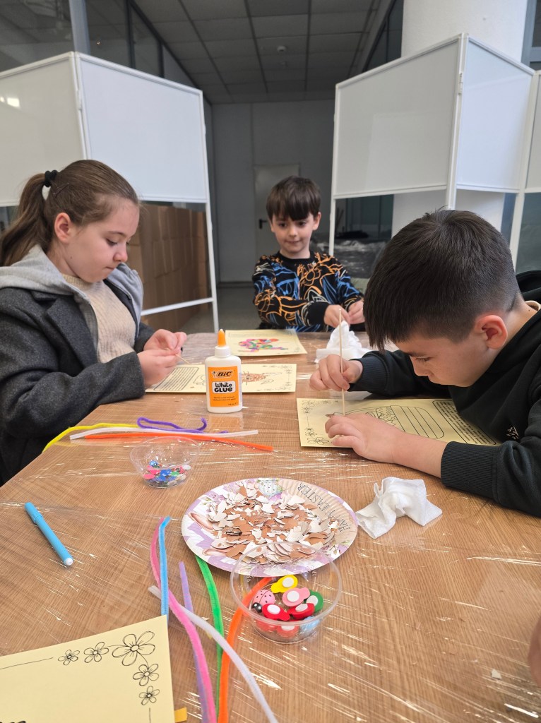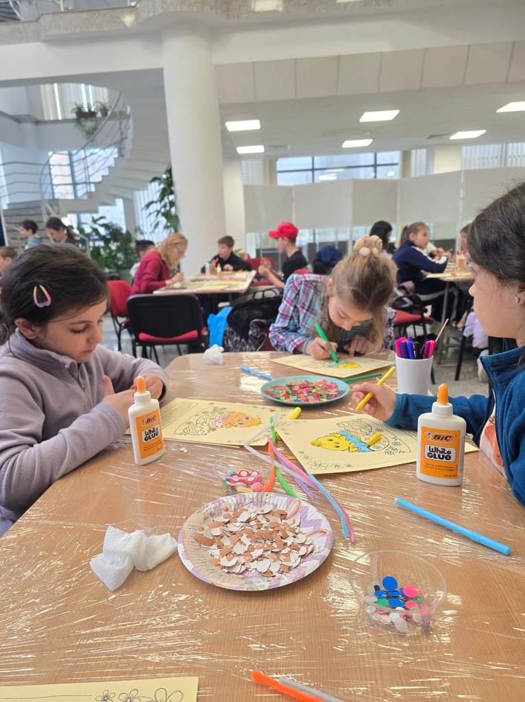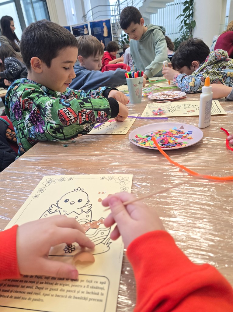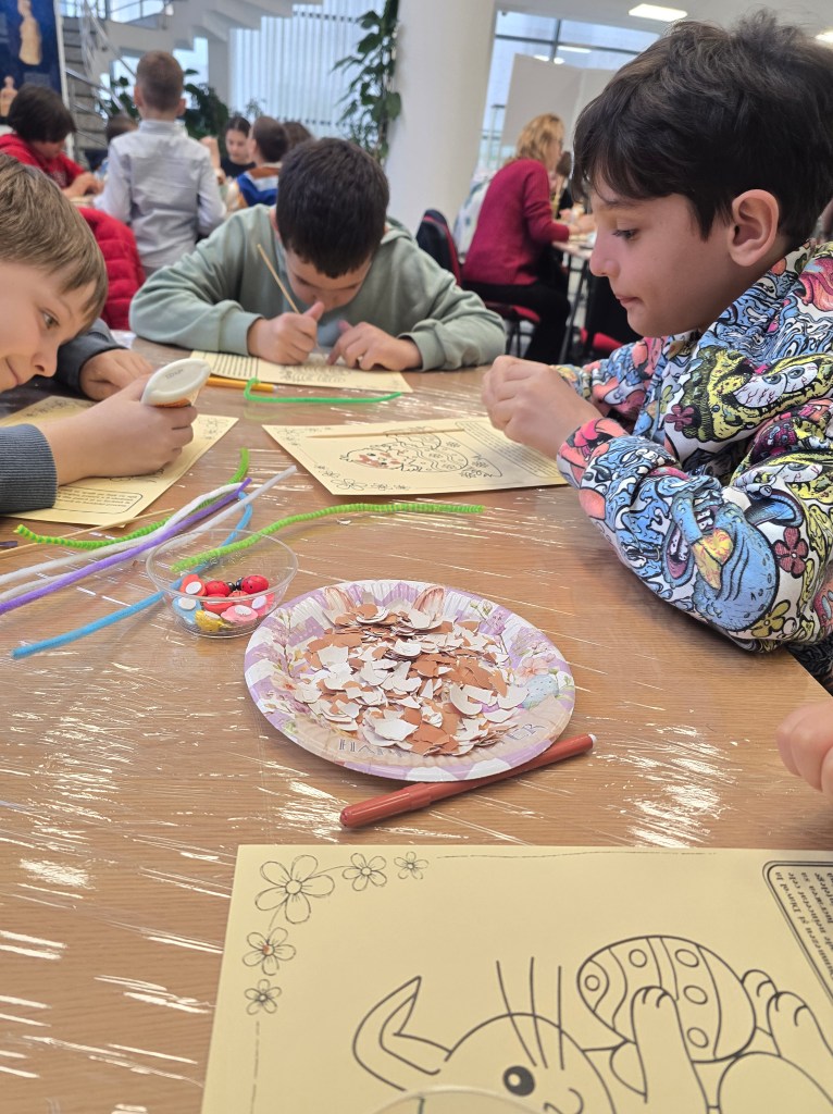 🐣 Din coji de ouă, cartoane, decorațiuni, adeziv și multă, multă răbdare, am confecționat tablouri în șabloane pregătite cu grijă de gazdele noastre.