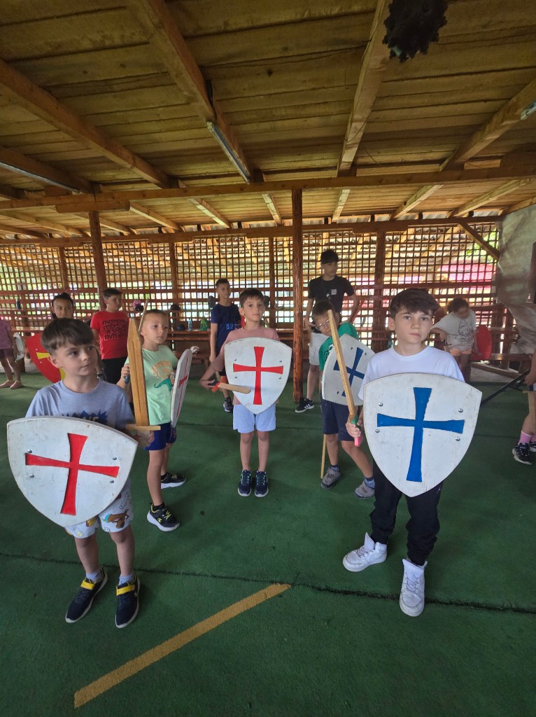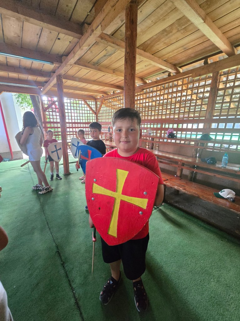 Au urmat jocurile – cu râsete, strategie și multă energie! În atelierele de pictură heraldică, copiii și-au imaginat propriile steme, scuturi și simboluri, transformând hârtia și culoarea în povești personale de curaj și noblețe.