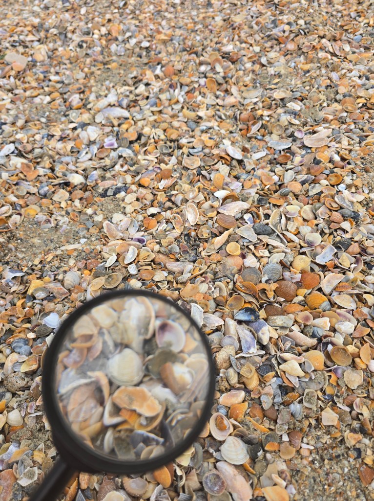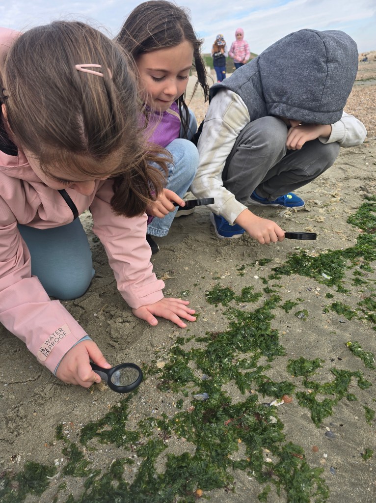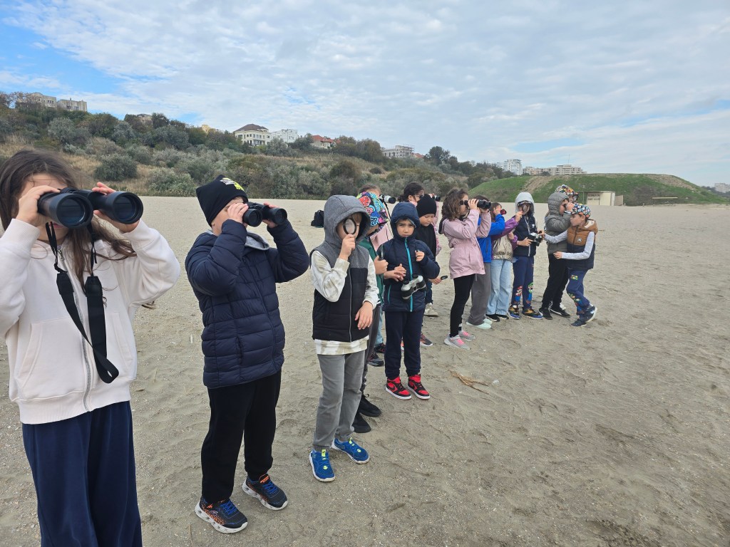🔍 Cu binocluri, planșe de observare și multă curiozitate, copiii au identificat elemente ale biodiversității marine: cochilii, scoici, alge, urme de viețuitoare și forme interesante sculptate de apă și vânt.