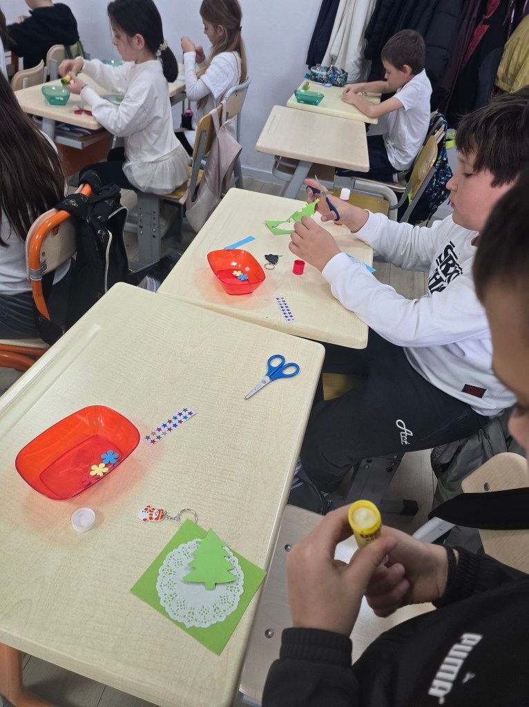 Elevi și profesori din mai multe școli confecționează decorațiuni pentru brad cu elemente specifice sau tradiționale și le vor trimite prin poștă partenerilor. 📬