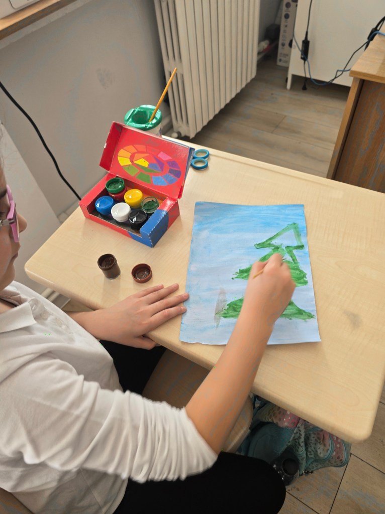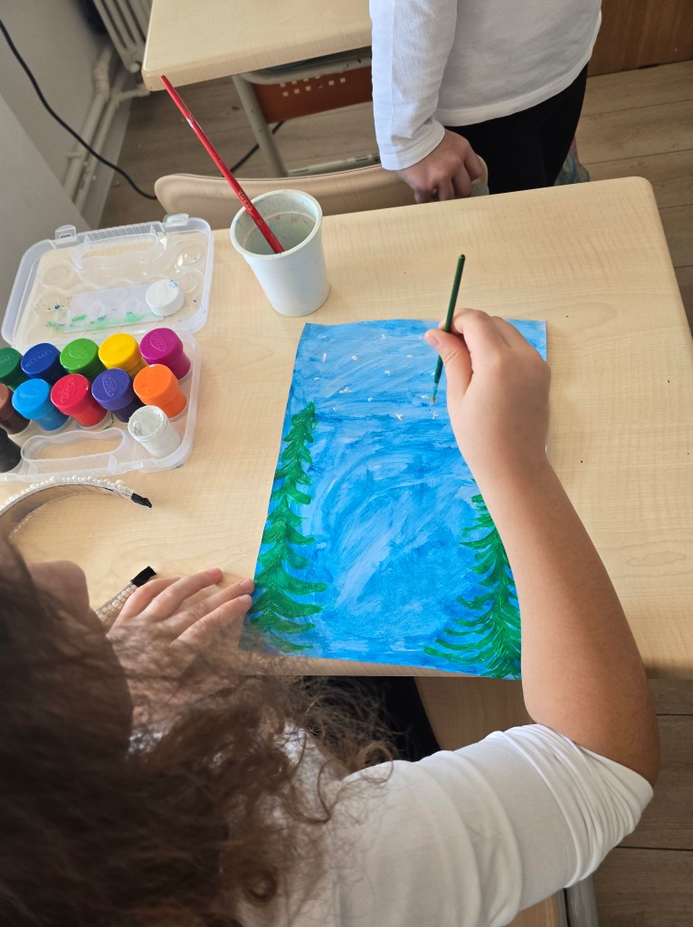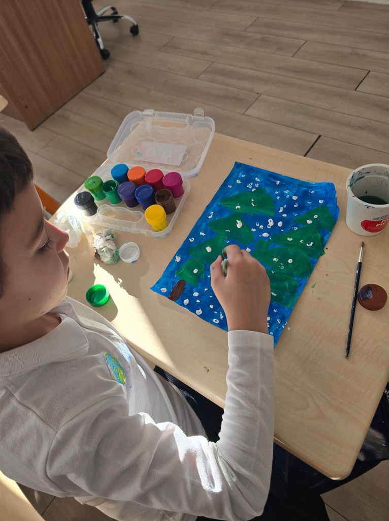 Locul: Într-o pădure cu brazi peste care se aștern fulgii de zăpadă – Continuăm să pictăm brazii și fulgii de nea